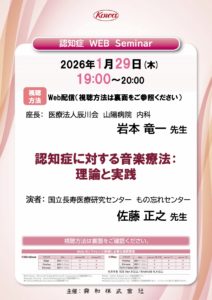 2026.01.19 【講演情報:佐藤正之】2026年1月29日(木) 認知症 WEB Seminar 2026年1月29日(木)19:00~20:00 認知症 WEB Seminar 国立長寿医療研究センター もの忘れセンター 佐藤正之先生 認知症に対する音楽療法:理論と実践 視聴方法 Web配信(視聴方法は画像をご参照ください) https://webinar.kowa.co.jp Post Share Hatena Pocket RSS feedly Pin it 「第5回MITトレーナー実地研修&資格試験@名古屋」開催決定&申込開...